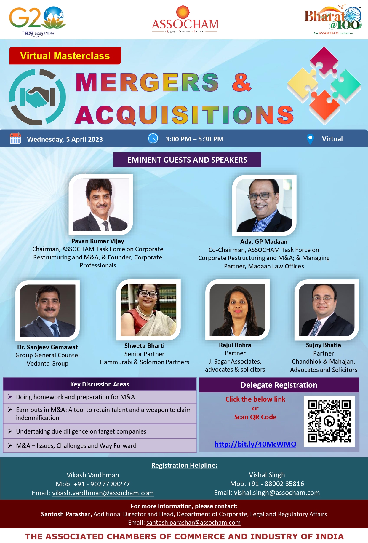 In this backdrop, the Department of Corporate, Legal and Regulatory Affairs, ASSOCHAM has carefully designed the Virtual Masterclass on Undertaking M & A from a lens aiming to impart high level of knowledge on do’s and don’ts which are essential for Mergers and Acquisitions in the contemporary times. The Masterclass is being organized virtually on Wednesday, 5th April 2023.